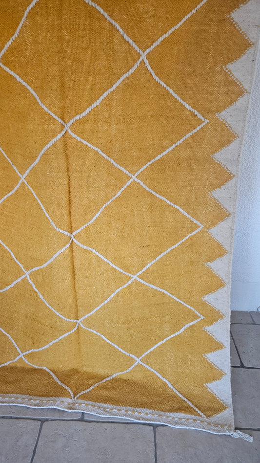 Magnifique pièce unique Tapis Zanafi Kilim jaune orangé motif ethnique dans la trame