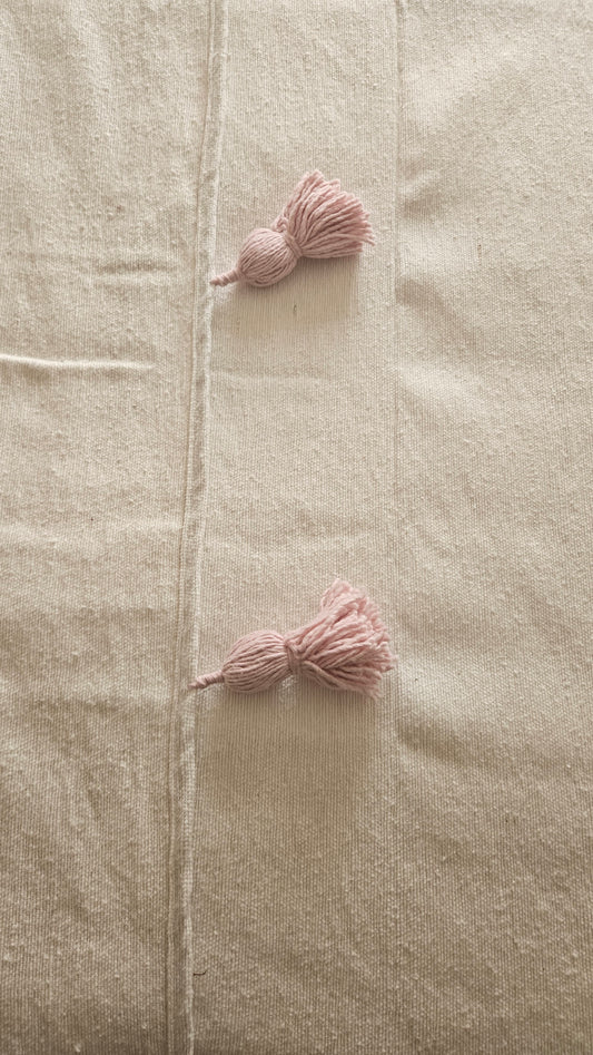 Plaid a pompoms marocain en coton écru et rose - Jeté de canapé berbère