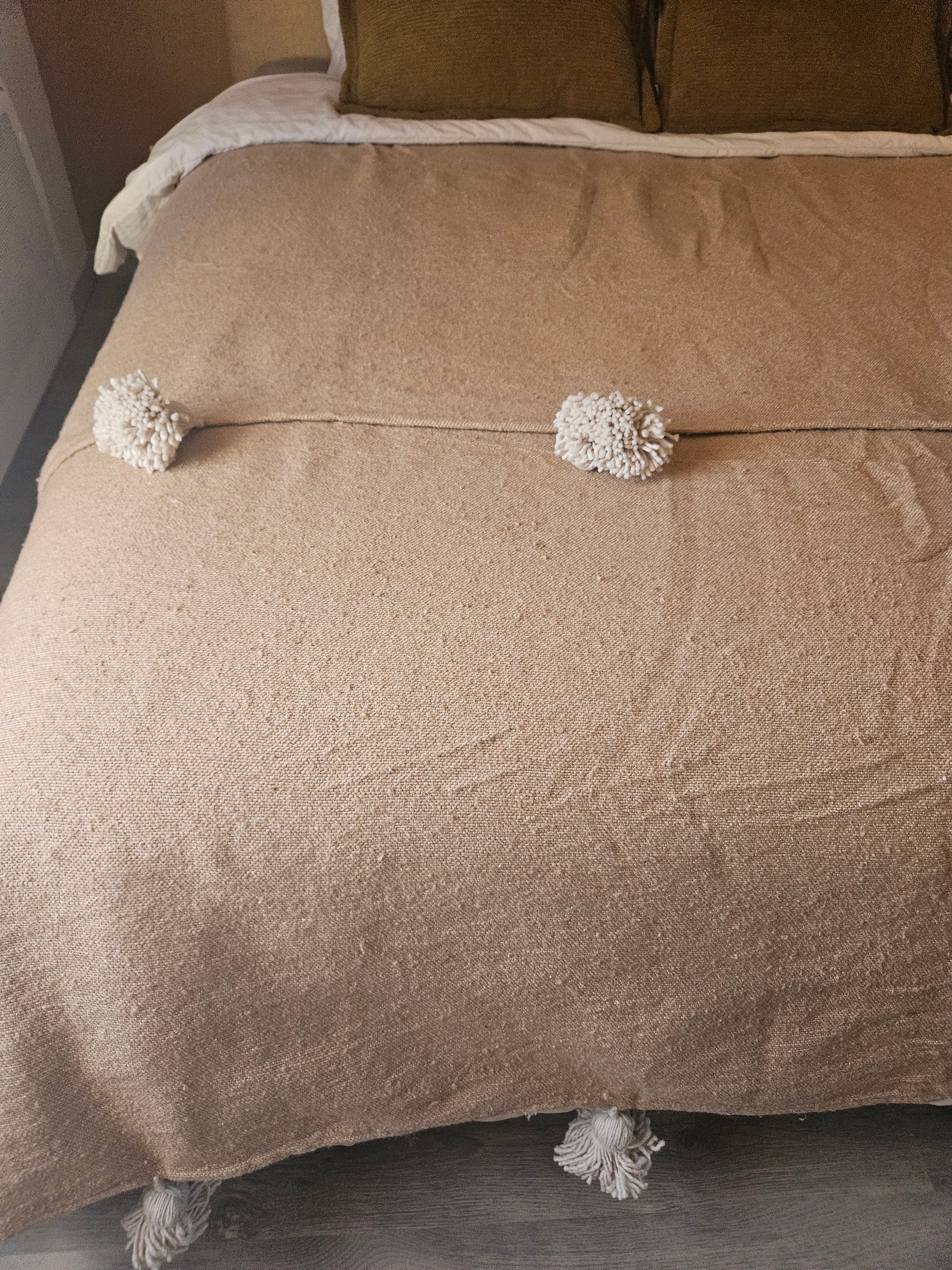 Superbe plaid Berbère Beige en coton avec pompons blanc en laine fabriqué et tissé a la main par des tisserands berbères de la région montagneuse de l’Atlas au Maroc.
