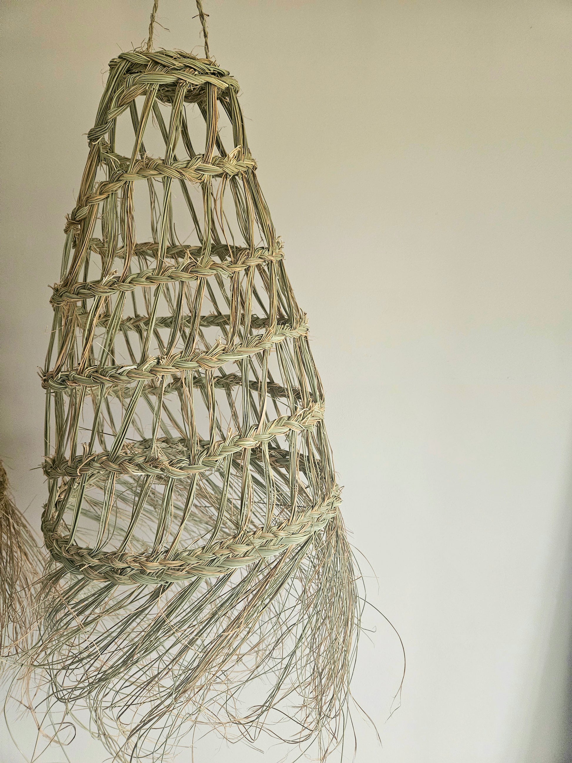 Grande suspension ajourée avec tressage serré réalisé à la main, matière naturelle, parfait pour votre intérieur ou terrasses d'été.